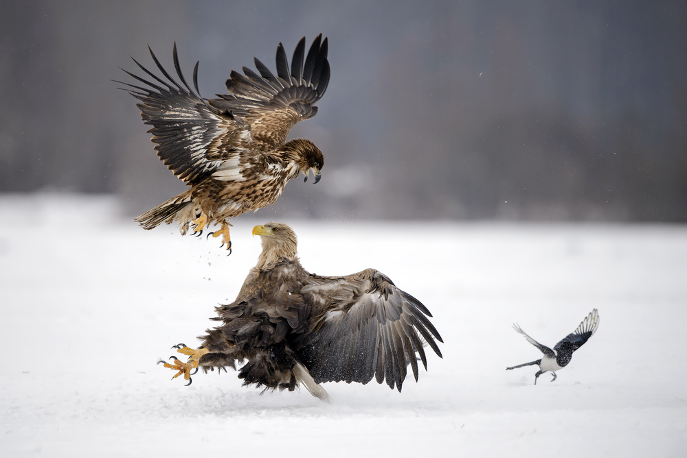 The photo has an intense interaction. There is an effective separation between the birds. It's sharp and has good impact.