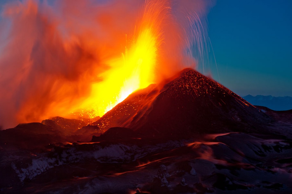 The most impressive shots are taken at sunrise and sunset since the sun paints the volcanic smoke in yellow, orange and purple. As the daylight dims, the lava starts to shine, the landscape changes dramatically and rivers of lava become visible. The sparks from the volcano look like a gigantic firework display. Set your camera on the tripod and use a remote control to fire the shutter. I do not recommend you to use the delayed shutter release option because the picture changes every second, and you should react as fast as you can. The settings on the camera depend on the type of picture and the effect you want to achieve. In my picture, "God of Fire," I wanted to show the power of the eruption, the sparks on the cone and the trails of lava from the explosion, so I set the aperture to f/8, ISO to 320 and shutter speed to 2.5 seconds. I thought it would also be a good idea to include some slopes of the volcano's cone and little clouds of steam as the light from the explosion illuminated them. This picture was made about 30 or 40 minutes after sunset; the light in the sky was already dim, but the sky was not completely black.