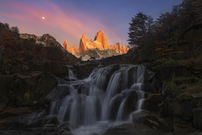 I really wanted to take a unique picture of this waterfall. By using the app PlanIt! for Photographers, I carefully chose my shooting time. I discovered that there was only one day from April to May, i.e., 24 April 2016, when the setting moon would appear right above the Fitz Roy peaks, and at the same time, the rising sun would just be high enough to project its light towards the peaks and make them shine.