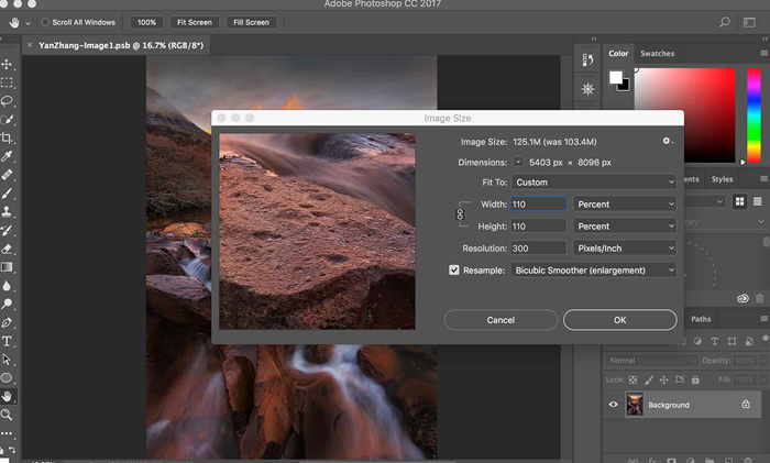 5. Change “Width” and (automatically) “Height” to 110 Percent, and check “Resample” to be “Bicubic Smoother (enlargement)”, as shown by the following Screenshot 3.