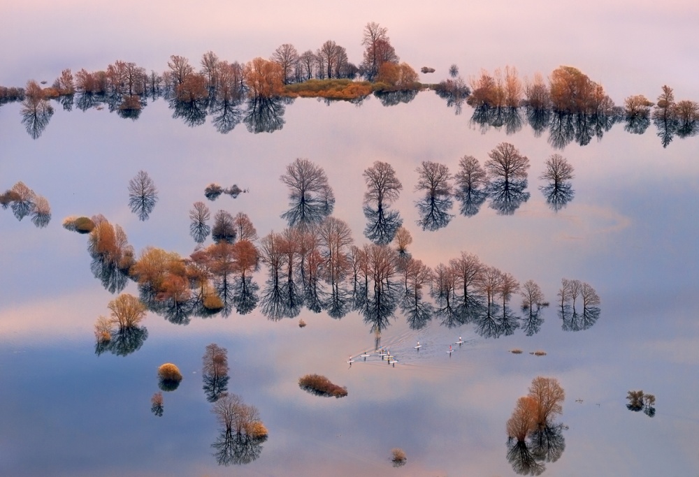 This water landscape of the flooded Planina Plain in Slovenia was taken in April 2013. I went there with a couple of photographer friends, hoping to capture some evening light on those trees. The photo looks like it was taken from the air, but it wasn't. It was captured from the hill above Planina Village, called Grmada, or simply Mt. Planina. It's a beautiful overlook and also a launch point for paragliders.
