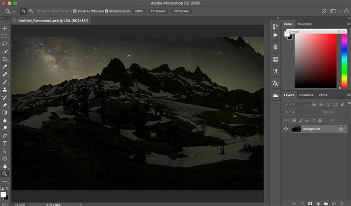 Taking Minaret Lake as an example, by using “Photomerge” function in Photoshop CC 2018, I did two photo merges, one for the series of 9 foreground photos, and the other 9 photos for the sky. The results are shown below: