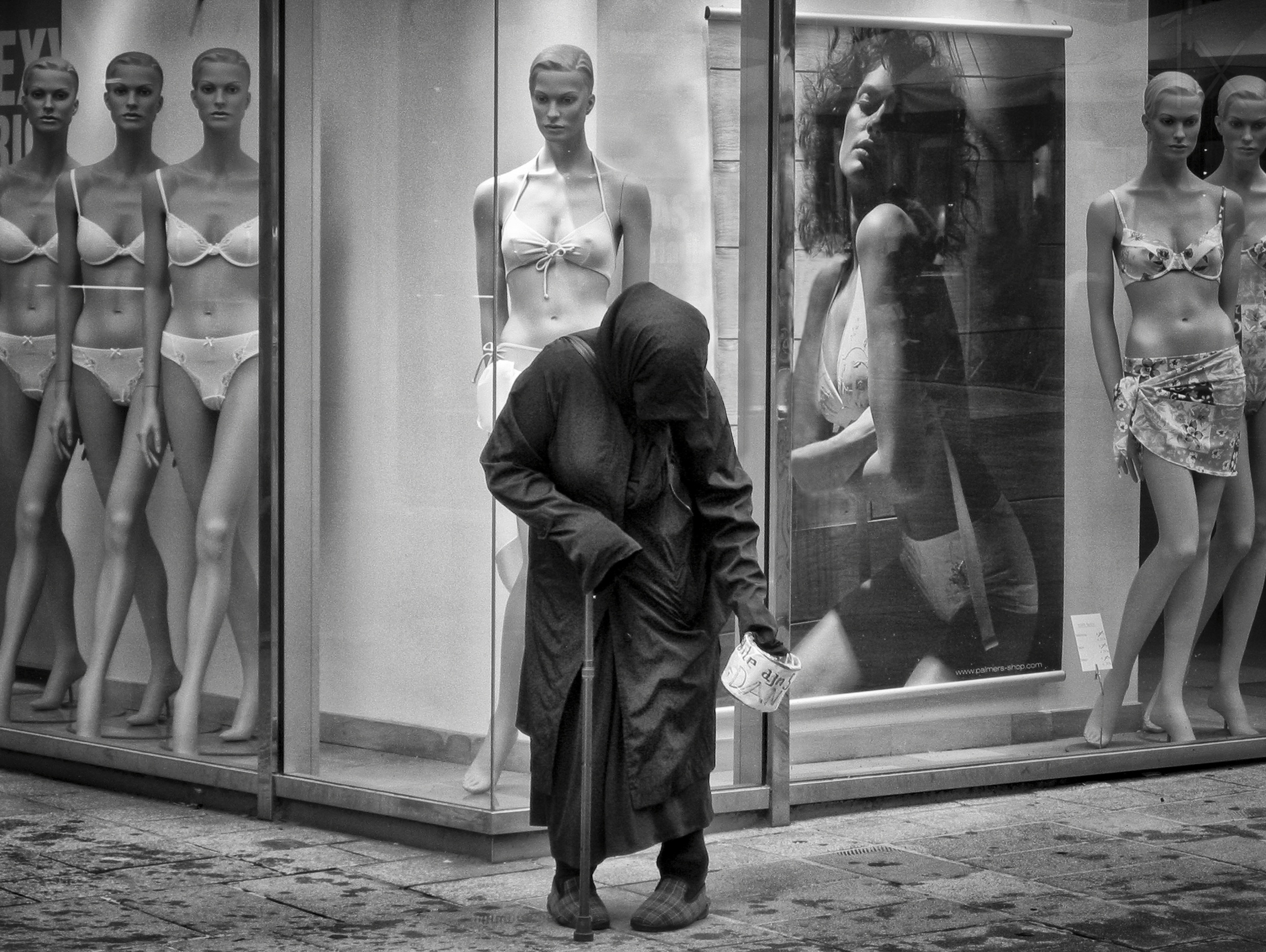 Poverty and opulence – contrasting scenes of poverty and wealth, such as a beggar in the street against a backdrop of an expensive clothing store can tell a multitude of stories