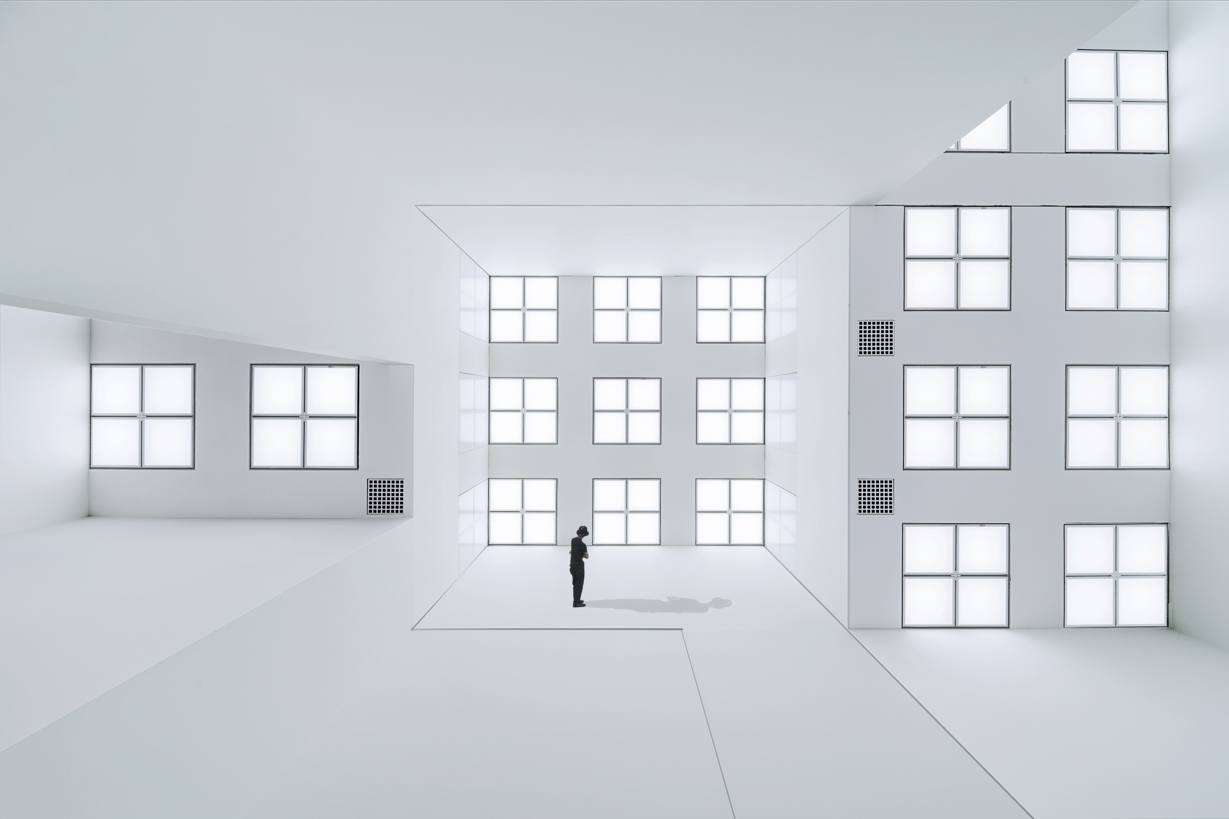 I was only able to realize this photo because I worked / processed after developing it. The main photo is a view on the ceiling in a German museum and the person is a visitor but (of course) on a completely different location in the museum. This way I could was able to create the illusion that the person was looking through different windows. Plus, white architecture is one of my favourites.