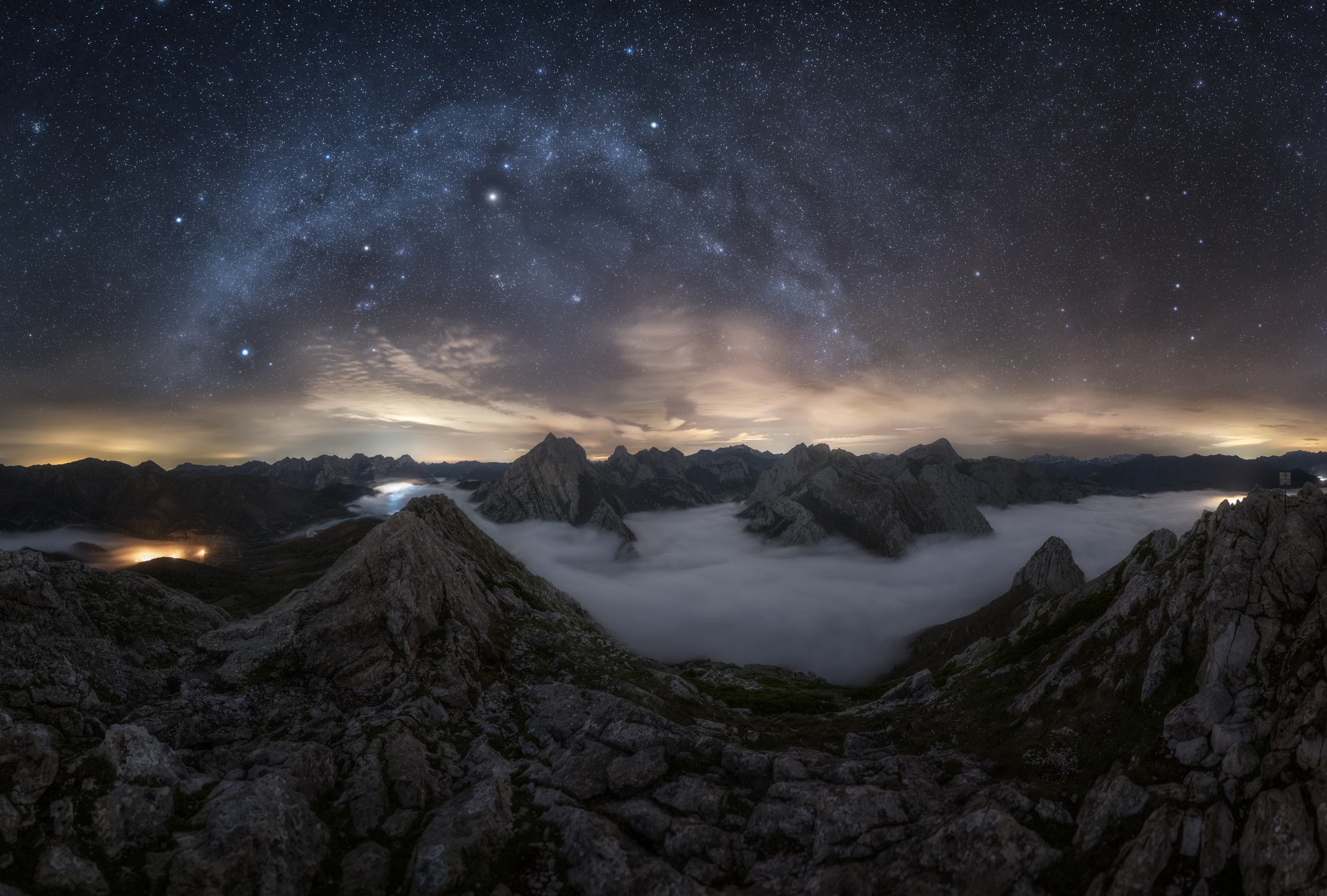 The resulting photo was merged and processed in Lightrroom and Photoshop with the typical adjustments of brightness, contrast, saturation, some adjustments in curves and treating some areas separately. Enjoying those conditions and that specific night were the reasons of 99% of the result.