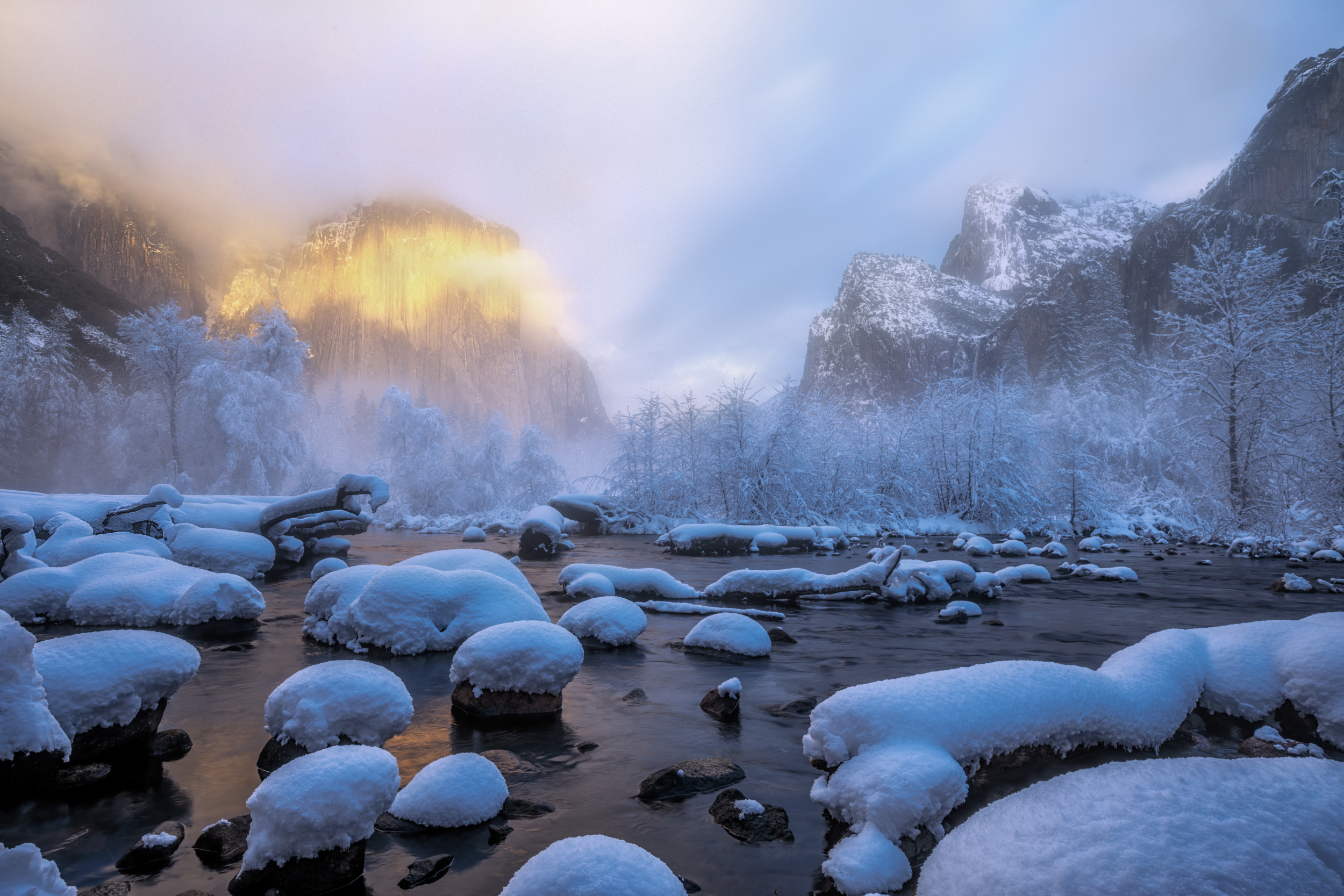 Yosemite National Park, located about three and half hours’ drive from my home, is one of my favourite places for photography, especially when it transforms into a winter wonderland, draped in a pristine blanket of snow. It is a challenge to photograph the Yosemite winter wonderland due to the unpredictable accumulation of snow in the valley.  Typically, the snow initiates its melting process shortly after the snowfall concludes. Consequently, timing becomes paramount—arriving at the valley before the end of snowfall would be the best. This often requires navigating to the park amid heavy snowstorms, a task that presents an additional challenge for those of us more accustomed to non-snowy areas. I took numerous winter trips to Yosemite in the hope of capturing the beautiful winter scenes but all previous trips ended without the desired outcome due to insufficient snow cover.