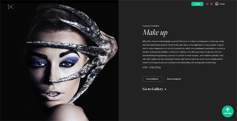 To start creating a new exhibition go to your profile. Click the account menu in the top right when you are logged in to 1x and then the button "Go to your profile". Click "Create a new exhibition" at the top to get started.